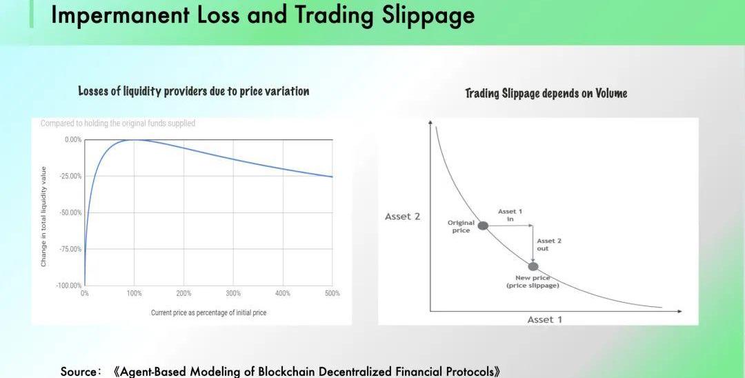 -巨额交易放大AMM滑点:AMM机制是DeFi的核心基础,但是其无法规避大宗交易带来的价格冲击。在市场下跌时,用户往往有兑付资金的及时需求,当交易在短时间内大规模发生时,Swap内的质押资金难以满足用户的交易需求。首先,DeFi生态中,SwapProtocols内质押资金规模与LendingProtocols内质押资金规模大体相当,在发生大规模清算时,SwapProtocol无法为清算提供足够的深度。更为重要的是,在AMM交易机制下,大额交易会显著影响市场价格,造成价格偏移。IgorMikhalev与ZoiaMandrusova在《Agent-BasedModelingofBlockchainDecentralizedFinancialProtocols》表明了他们的研究结果:交易规模与滑点呈正相关,单笔大额交易将会打乱交易价格。UST在Curve协议上脱锚就是最好的例子。5月7日,在STw-3CRVCurve资金池中,一笔以8500万美元UST兑换USDC的交易直接导致了UST流动性枯竭,以AMM为基础的DeFi在面临市场发生危机时,显得有些力不从心。