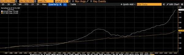今年年初的抵押贷款利率在3%左右,现在略高于5%。由于这一变化,美国家庭资产负债表中位数已经恶化了10%以上。更大的问题是,贷款金额的增长速度继续高于通货膨胀。回顾上面的房价与通货膨胀的关系图,想象一下,如果中位数房屋的价格降低到与1985年以来75%的通货膨胀率相匹配,会是什么样子?家庭资产负债表会是这样的。