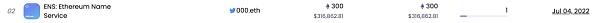 事实上,从今年4月底开始,ENS就开始有了比较大的起色,交易量激增数十倍,三位数、具备特色的及稀有域名的底价翻了又翻,甚至一度登顶过NFT交易量排行榜,000.eth更是在6月份卖出过300ETH的天价。像百威、蒂芙尼、Opensea等大型厂商花费几十万美金购买ENS域名的更不在少数。