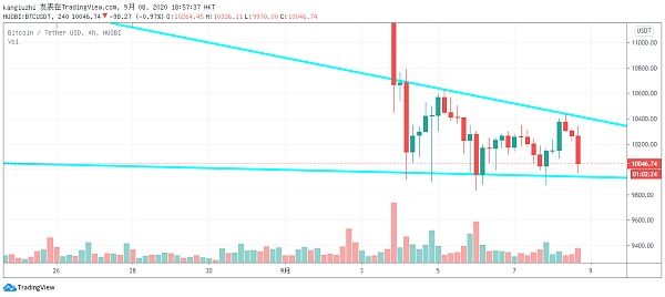 根据火币交易平台数据显示,从小时线上看,BTC继昨夜拉升之后,并未站稳10300关口,日内持续下行,并伴随成交量的逐步放大,再次下探10000整数关口,最低达到9970 USDT。从四小时线上看,BTC自9月4号起逐渐走出下跌三角形整理形态,几次下探三角形下沿线10000 ,成交量逐渐缩小,当前或是下跌趋势的中继,夜间关注是否能站稳10000关口以及下方的支撑位9500。