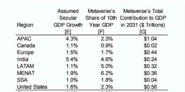 如果元宇宙在2022年开始采用,那么元宇宙在2031年对全球GDP的总贡献将为至少3.01万亿美元。