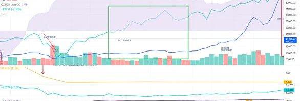 在比较BTC价格与NDX100指数关系时,我们采用了CC指标。紫色区域在水平线上越大,代表二者正相关性越大;在水平线下越大,表示二者的负相关性越大;越接近水平线,二者相关性越小。