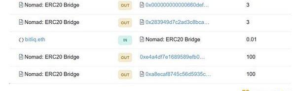 8月2日7时,加密KOL@0xfoobar发推称,跨链互操作性协议Nomad桥正在被黑客攻击,WETH和WBTC正以每次百万美元的频次转出,合约中仍有1.26亿美元可能存在风险。提醒用户尽快提取资金。最近的一次就有1万枚以太坊转出,Nomad桥还有8000万美元的USDC正在流出。