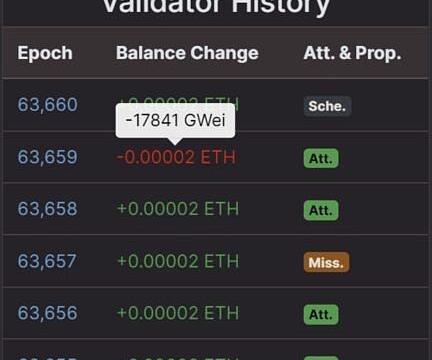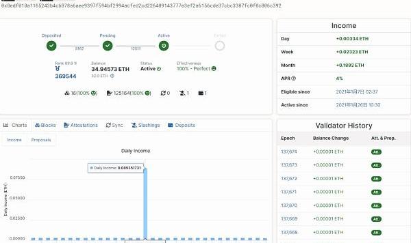 通过观察信标链的区块链浏览器我们可以看到,下图详细信息显示该周期被99.8%的活跃验证者即总质押量13,177,296个ETH中的13,150,835个ETH的权益投票签名并出块,每个插槽中的分片区块都由不同的验证者出块并经过三分之二以上活跃验证者的投票签名通过出块。