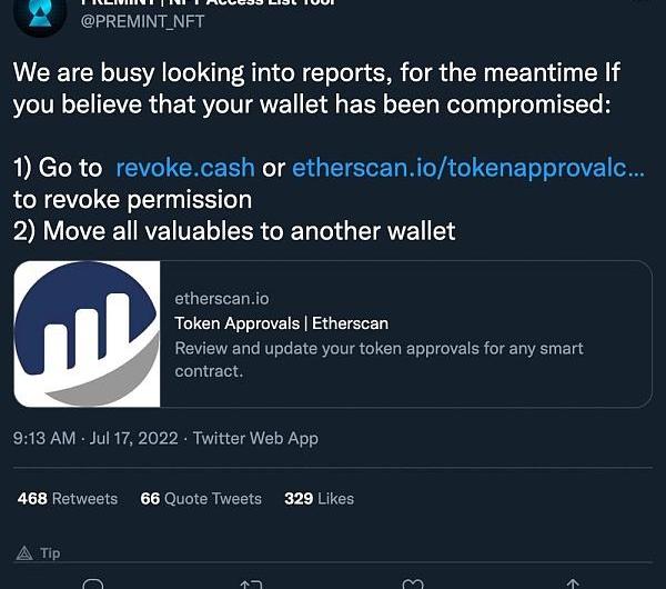 针对这次攻击,Premint的推特账户发布了一个警告:不要签署“全部批准”的交易,并指示那些怀疑自己被黑客攻击的用户如何联系revoke.cash来取回他们的资产。