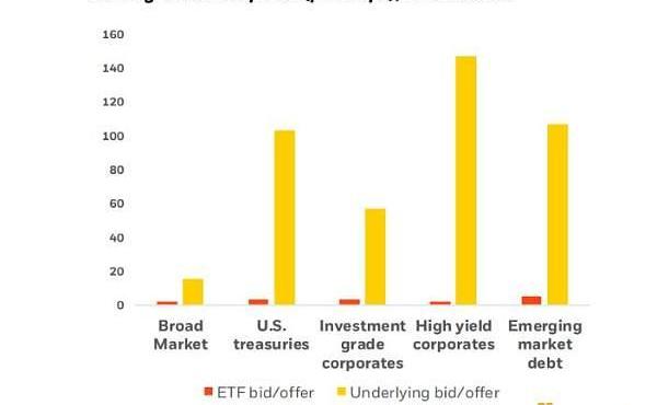 从第一份数据可看出,在2022年三月,ETF债券要比它的标的资产拥有更多的流动性。一些研究也表明,这种聚合投资减少了来自资产甩卖的影响。?