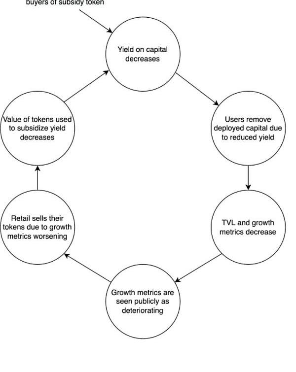 这导致非常重要的基本指标如TVL下降,使补贴代币不再看起来像吸引人的投资。随着基本面的“改变”,代币投机者变得更加看跌,开始抛售。这导致收益进一步下降,更多资本离开,......而这个循环加速了。