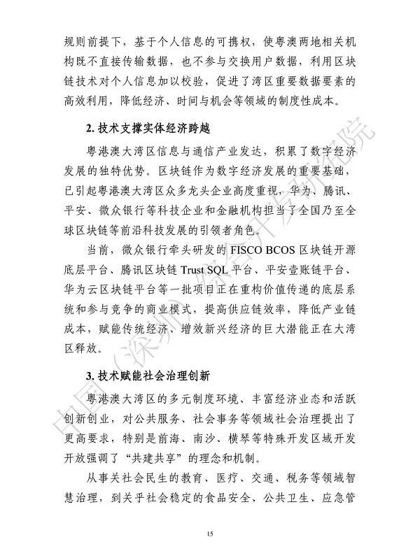 作为一大亮点,报告引用了大量基于FISCOBCOS,并在粤港澳大湾区落地的应用案例:在数字经济发展方面,“粤澳跨境数据验证平台”、“湾区金融科技人才链”、“珠三角征信链”、“深证金融区块链平台CapitalBCOS”等案例入选;在数字社会建设方面,“澳门智慧城市建设之证书电子化”、“粤澳健康码跨境互认”、“腾讯99公益日”等案例入选;在区块链推动数字政府建设方面,“网贷机构良性退出投票平台”、“区块链司法存证仲裁服务平台”、“深圳水务集团工地安全管理系统”、“智慧司法区块链留痕系统”等案例入选。