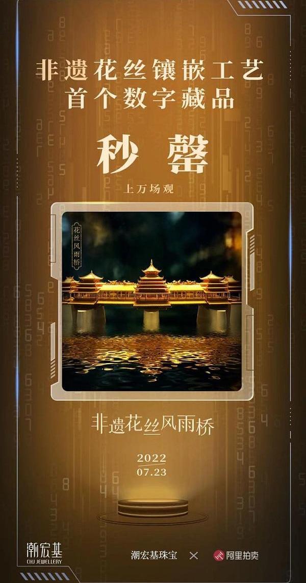 7月23日,潮宏基正式推出了全球限量999份的「非遗花丝风雨桥数字藏品」,并登录阿里拍卖对外发售。「花丝风雨桥」吸引了上万人围观,开售即“秒告罄”,足以见得大家对这款数字藏品的喜爱。