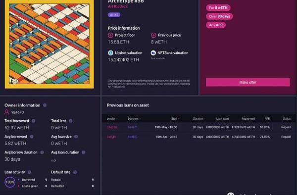 在艺术品抵押贷款市场,银行通常会根据客户的其他资产和业务对艺术品贷款收取2%-5%的费用,而艺术品贷款公司和拍卖行的收费通常为6%-9%。艺术品担保贷款的期限通常为一年,所有者通常可以借到艺术品估价的一半。NFT的典型贷款期限是10-30%的贷款价值比率和50%的年利率(APR)。年利率是指你每年为借钱而支付的费用,包括各种费用,用百分比表示。年利率是一个更广泛衡量你(借款人)借贷成本的指标。