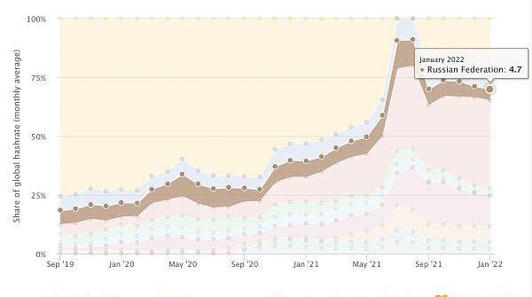 俄罗斯杜马加密货币立法监管工作组成员AndreyLugovoy表示,由于气候条件、电力过剩且成本低廉,俄罗斯有可能成为世界上第一大加密货币挖矿国。据剑桥大学另类金融中心(CCAF)的数据,截至2022年1月,俄罗斯以占据比特币全网算力4.7%的市场份额排名第五。
