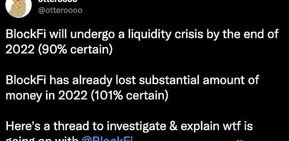 6月17日,DeFi分析师otteroooo发推表示,数字资产抵押借贷平台BlockFi将有99%的概率在2022年底发生流动性危机,并称,由于Celsius以及三箭资本事件,十分确定BlockFi一惊损失了大量资金。