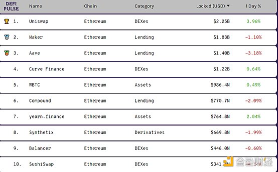 DeFi排名前十锁仓量 数据来源:DeFi Pluse