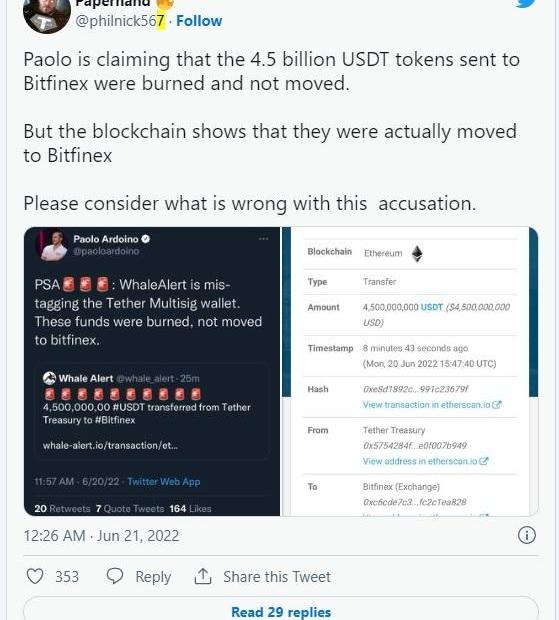 同样在上周,Tether也“意难平”地发表了一份声明,驳斥了所谓“储备金谣言”,也就是关于将其现金储备投资于商业票据的指证。2021年9月,Tether因将其大部分的现金储备投资于商业票据而引发了大量关注。
