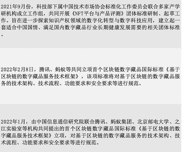 与数字藏品监管并进的是标准的制定。制定标准具有重要意义,一方面通过制定技术标准,能够推动技术的研发和互通。另一方面行业标准的制定有利于企业规范运营。目前,数字藏品相关标准的制定仍处于初期阶段,政企机构正积极合作以建立相关标准。从相关内容看,国内数字藏品的标准化工作主要从理论层面对NFT或者数字藏品的技术和产品做出规范。