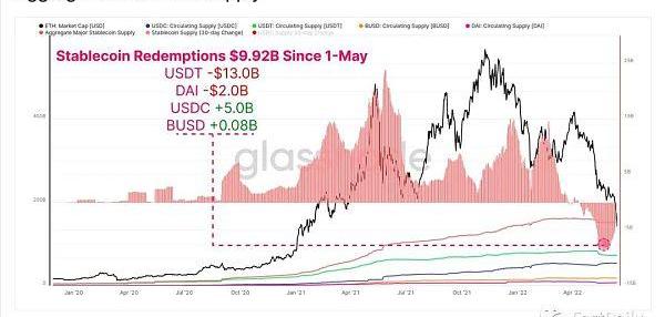 自5月初以来,稳定币赎回总额为99.2亿美元,资本从市场流出。USDT的赎回量最大,为-130亿美元,其次是DAI,为-20亿美元,因为投资者关闭了通过MakerDAO金库获得的杠杆。有趣的是,自5月1日以来,USDC的供应量增加了50亿美元,这表明市场的偏好可能从USDT转向USDC,成为最受欢迎的稳定币。