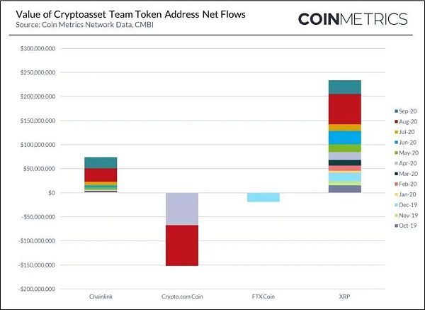 2020年第三季度,团队控制地址余额的最大净变化是XRP(+1.05亿美元),LINK(+5880万美元),ETH(+450万美元)和CRO(-8460万美元)。