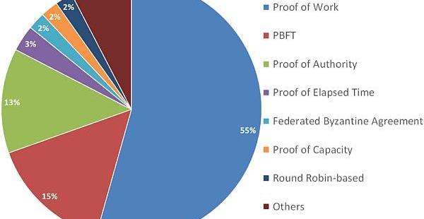 区块链活动也可以根据使用的平台和共识算法进行分类。60%正在开发基于以太坊的解决方案作为起点,而55%使用过PoW算法。