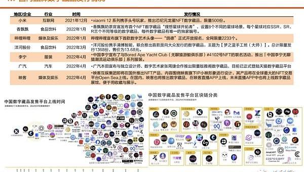 海内外NFT发展快速。海外Coinbase推出NFT市场,通过社交媒体实现差异化,OpenSea收购NFT聚合器Gem;国内,互联网巨头相机出品交易平台以及艺术类数字藏品,例如平台有腾讯幻核和鲸探,藏品有齐白石画作和敦煌飞天NFT付款码皮肤。博物馆利用NFR使文物新的方式走进大众视野。伴随着更多的商家的进入,国家文交所等政府单位对数字藏品交易进行合理规范并出台相关政策加以规整。
