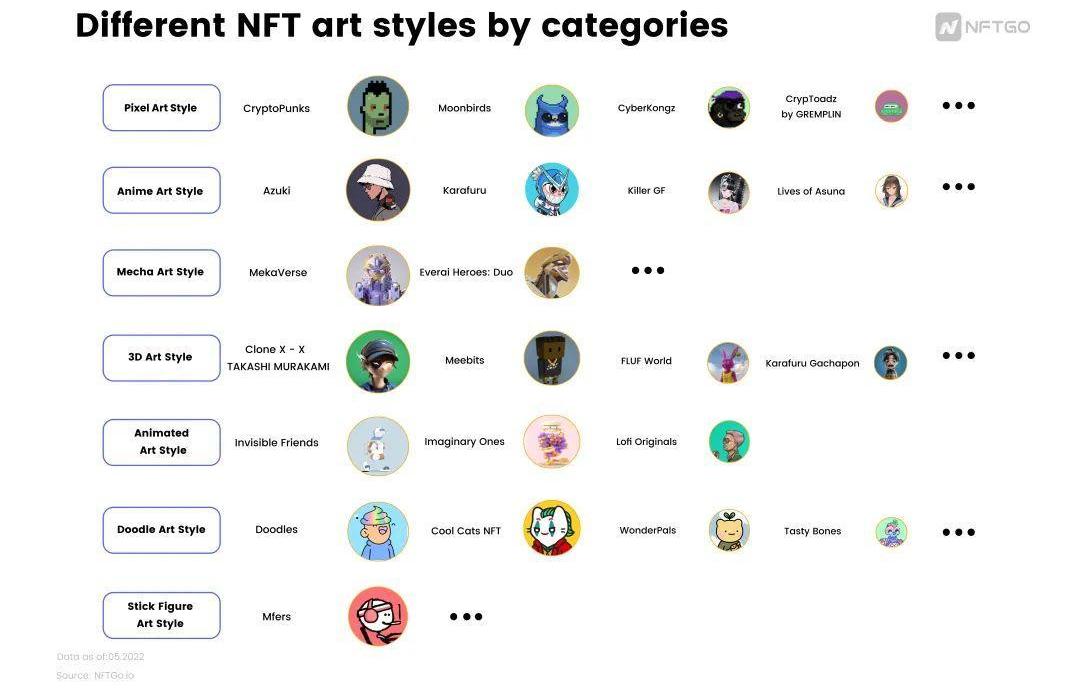 纵览整个NFT市场每个项目的画风,都有各自的特色。尤其在近一年NFT市场总市值的爆发期内,包括日系漫画风、机甲风、可爱风、极简画风在内的众多风格,都逐步加入到了整个NFT的生态中。以下根据画风分类,列举部分NFT市场的项目。