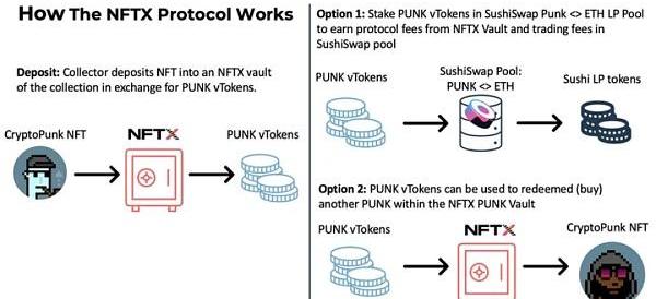 NFTX是专注于地板款NFT赛道的项目,让使用者可以将地板款的NFT存入项目金库,并换成等值的vToken(ERC20),让其他人可以投资部分的地板款NFT。对于中高价位的同系列NFT,由于价值定位困难,且难以进行等值vToken的计算,NFTX决定舍弃这块市场,专注于做可以直接对标的NFT项目。