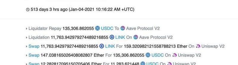 下面是一个典型的清算案例:一个机器人向AAVEv2偿还了135kUSDC以换取11kLINK。随后这个机器人以159ETH的价格出售了这些LINK,并最终获取12ETH。
