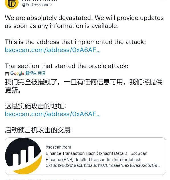 北京时间2022年5月9日,知道创宇区块链安全实验室监测到BSC链上借贷协议FortressProtocol因预言机问题被攻击,这是最近实验室检测到的第三起预言机攻击事件,损失包括1,048枚ETH和400,000枚DAI,共计约300W美元,目前已使用AnySwap和Celer跨链到以太坊利用Tornado进行混币。