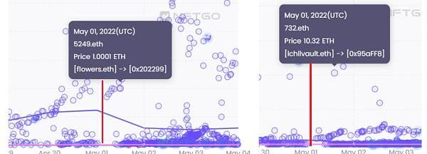 在4月26日出现一笔成交价格为2E的域名“914.eth”后,ENS的交易量便开始爆发,并多次出现“四位数字域名”:“0115.eth”、“0589.eth”、“7304.eth”、“9283.eth”。同时它们的成交价格也开始逐渐爬升,并在4月27日-4月30日之间再次出现像“9559.eth”、“2049.eth”的高价成交单。