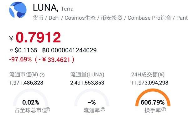 5月12日晚23:00,LUNA跌破0.01美元,报价0.0065美元,LUNA再次日内跌幅99.85%.