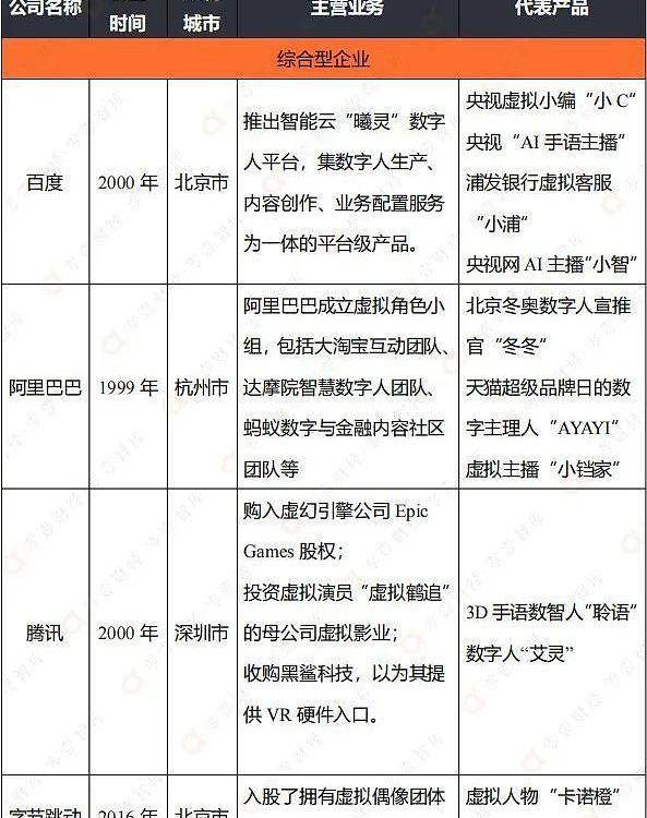 此外,互联网巨头企业例如百度、阿里巴巴等以综合性厂商的形式出现在虚拟数字人产业,这类公司在底层技术、应用平台以及虚拟空间的打造上展现出较强的综合性实力。