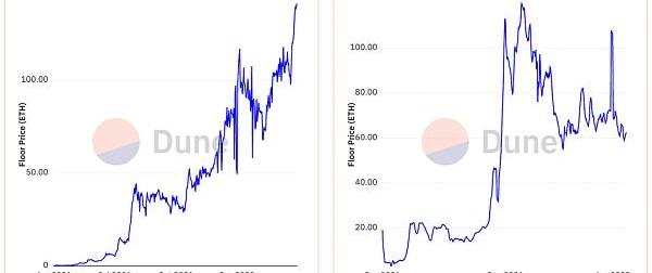 上图:BAYC和CryptoPunks的底价变化情况。来源:DuneAnalytics