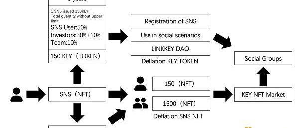 与此同时,用户在SNS上注册是发布KEY令牌的唯一条件。当新的SNS注册时,智能合同将签发150个KEY,SNS可以称为KEYToken的“挖矿设备”。