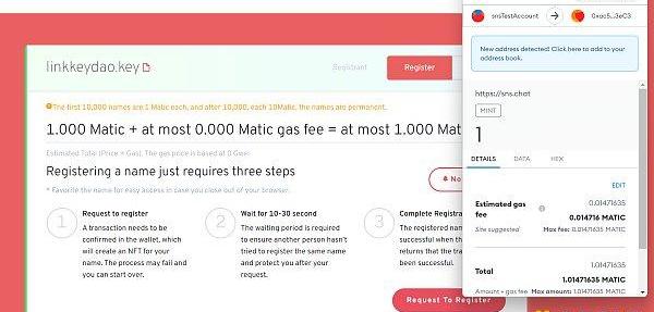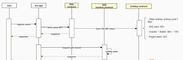 SNS是LinkKey中一个非常重要的分散式用户名系统。该协议规定,所有用户名都是***.key,例如alice.key,1个密钥只能绑定1个ETH,该名称将自动生成为NFT,未使用的名称可以自由传输和交易。如果个人NFT和社区NFT是通过sns发放的,则无法交易该名称。