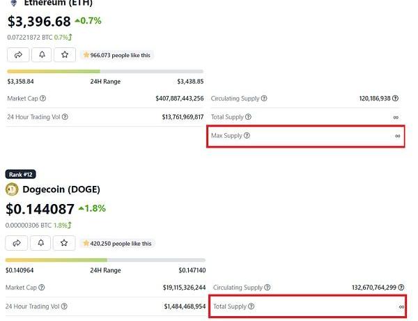 但“无限供应”并不总是一件坏事,目前,以太坊(ETH)和狗狗币(DOGE)都有无限供应。