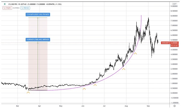 SNX作为2020年表现最好的加密货币之一,在这一年中表现得非常出色。该加密货币从0.4美元的年内低点一路上涨至7.5美元的历史最高价格。如下图所示,从3月到7月下旬,SNX唯一的表现就是上涨!
