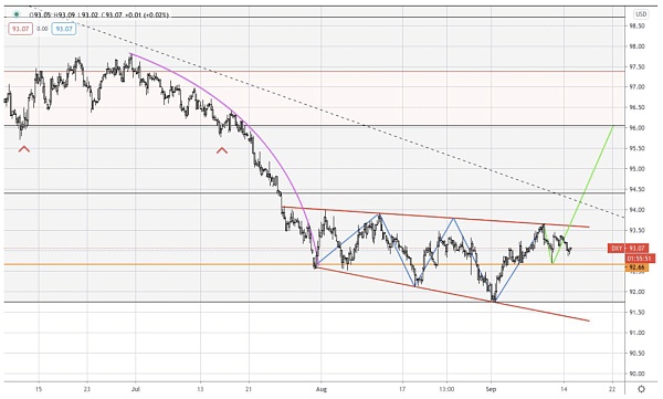 除了看前面三个货币对的走势图,我们还可以从下面的DXY走势图中看到,美元正在通过这种看涨的扩大形态获得力量。DXY是在布雷顿森林协议瓦解,美元脱离黄金后生效的。