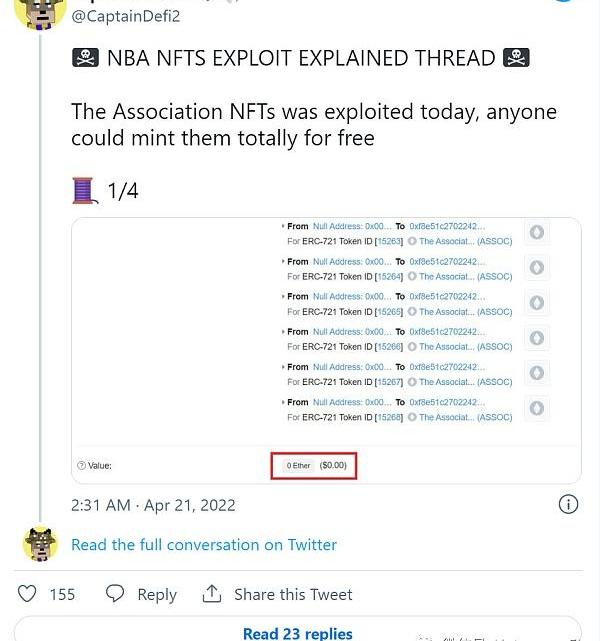 篮球联盟昨天推出了一个名为“TheAssociation”的新NFT集合,旨在为NBADiscord服务器的最早成员提供独家NFT。没有想到的是,集合的智能合约中出现了安全漏洞:在NFT能够被创建和交易的计算机代码,导致用户在不公平地铸造NFT,并在大约一个小时内清理集合。