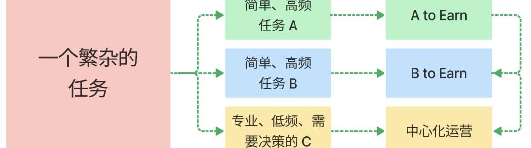 如果我们看到一个场景具备2earn的潜力,那么一定要尽可能把他拆分,其中高频的行为,可量化的行为,可以设计成2earn模型;不可量化的、复杂的、个性化的行为部分,保留中心化的业务模式继续运作。
