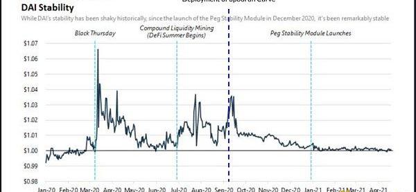 接下来,挂钩稳定性模块于2020年12月推出。从那时起,DAI一直能够在很小的偏差范围内保持与美元的挂钩。
