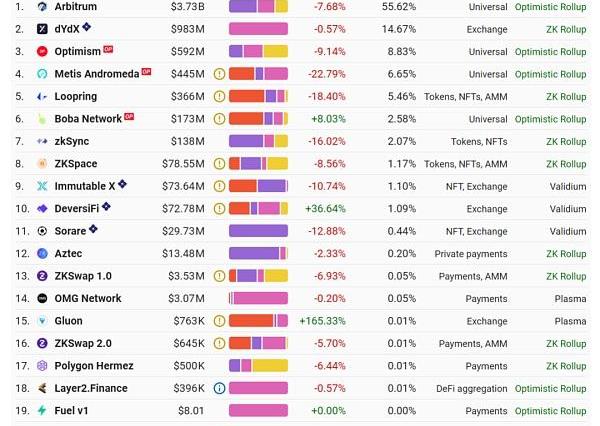 依据I2beat.com最新数据显示,二层方案锁定资产规模约在67亿美元左右,其中OptimisticRollup二层扩容方案是由Arbitrum和Optimism提出并首先推向市场,目前占据了二层方案的半壁江山。零知识证明方案锁定的资产规模仅约17亿美元,原因在于技术实现难度更大,生态应用搭建还未真正落地。