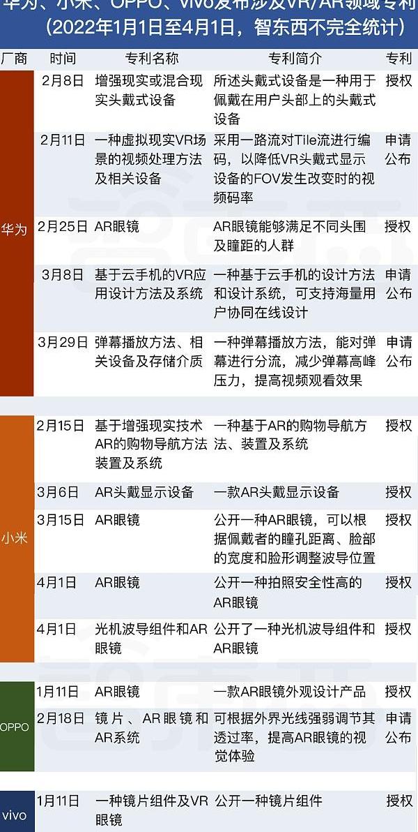 据智东西不完全统计,仅2022年,华为、小米、OPPO、vivo四家手机厂商就公布了13项与VR/AR有关的专利,涉及VR/AR基础技术、外观设计、光学显示等多个领域。