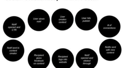 /用户创造内容,用户提交,计算有多少社交联系人,内容被通知,接收者点击打开内容,接收者登入网络,接收者提供反馈,创造者接到通知,通知被打开同时可以看到点击率,创造者阅读通知