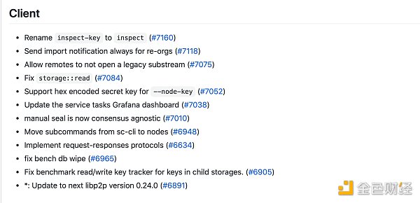 其中包含了例如允许设置任何账户做抵押的奖励目的地、更新任务Grafana仪表板、libp2p客户端更新、grandpa-rpc api更新等。