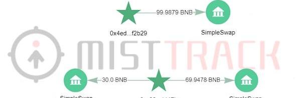 分析过程中,地址引起了我们的注意。如图,据慢雾MistTrack显示,该地址将Tornado.Cash转给它的ETH转出给了SimpleSwap。