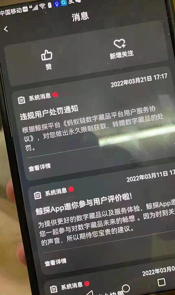 “经核实,近日您在抢购数字藏品过程中存在使用外挂、脚本等第三方软、硬件的违规行为,且造成了恶劣影响。根据鲸探平台《蚂蚁链数字藏品平台用户服务协议》,特对您的账户做出永久限制获取、转赠数字藏品的处罚。您账户中已购数字藏品的其他功能不受影响。鲸探平台始终维护平台公平公正的获取环境,坚持杜绝外挂行为的发生。如果将来我们发现您再次违规,我们将处以更严厉的处罚,包括但不限于账号的封禁。针对严重违规账户,鲸探将采取严格的封禁制度,一经核实立即封禁相关账号,同时鲸探平台将收集保留相关计算机系统证据,依法追究所有不正当竞争账号及相关人员的法律责任。”
