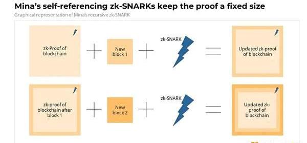 在zk-SNARKs的帮助下,Mina可以拥有一个保持较小且固定大小的区块链版本。每当添加一个新区块时,必须创建一个携带前一个区块的zk-SNARK的新zk-SNARK以证明它是有效的。只有在区块数据正确的情况下才能创建此SNARK。因此,一个SNARK证明当前区块是有效的,并引用前一个区块的SNARK来证明它是有效的。这样,区块链的整个状态就可以通过验证当前的SNARK来确认,因为它必须是在一系列有效的SNARK之上生成的。