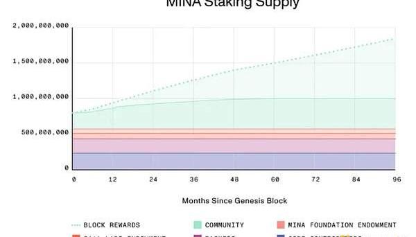 有多种方法可以查看MINA的供应量,例如不包括时间锁定代币的循环供应量或包含它们的完全稀释供应量。最简单和最准确的方法是通过质押供应。MINA的初始总供应量为10亿个代币,其中8.06亿个在发布时可用于质押。这些代币中的大多数都被锁定以供出售,但可以进行质押,从而获得了整体奖励。随着时间的推移,剩余的1.94亿个初始供应代币将以增压奖励、SNARK挖矿奖励和生态系统赠款的形式分发给社区。