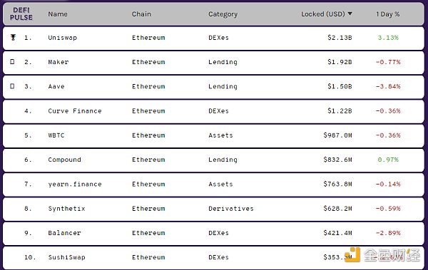 DeFi项目锁定资产前十排名及锁仓量,数据来源:Defi Pulse