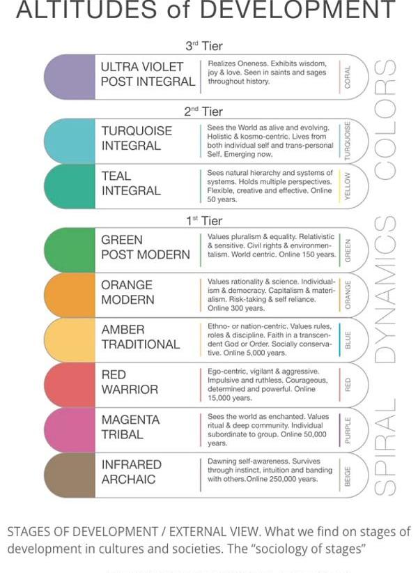 “超越和包容”的洞察力是这些工作机构的一个关键收获。当一个社会超越这些阶段时,这些发展阶段并没有被看作是过时的。相反,它们被纳入到下一个进化中,每个阶段都包括并在前一个阶段的基础上建立新的系统。一个以"仪式"为巅峰社会技术的红色社会,与一个拥有琥珀色的价值观、角色和纪律,并仍然使用仪式来实践和加强这些价值观的社会,其运作方式将非常不同。