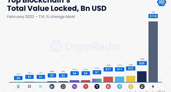 与此同时,NFT市场正经历一个整合阶段。尽管交易量比1月份有所下降,但与NFTdapp交互的独立的活跃钱包数量比以往任何时候都要多。此外,机构投资者正越来越多地与DeFi联系在一起,因为该领域正在演变为一个更加整合和成熟的生态系统。同时,包括多个虚拟世界在内的玩赚dapps仍在积极发展。